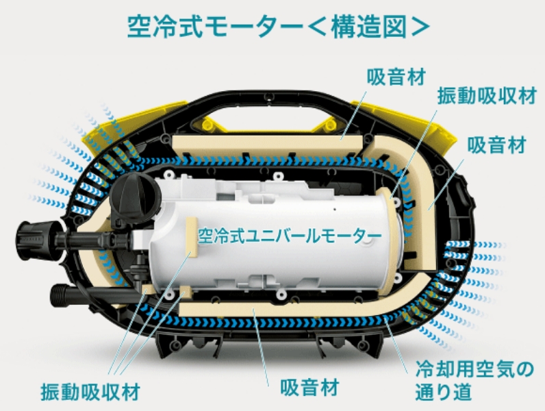 パワフルなのに軽くて静かな高圧洗浄機です。空気の流れを工夫し吸音材を採用した空冷式静音モデルです。