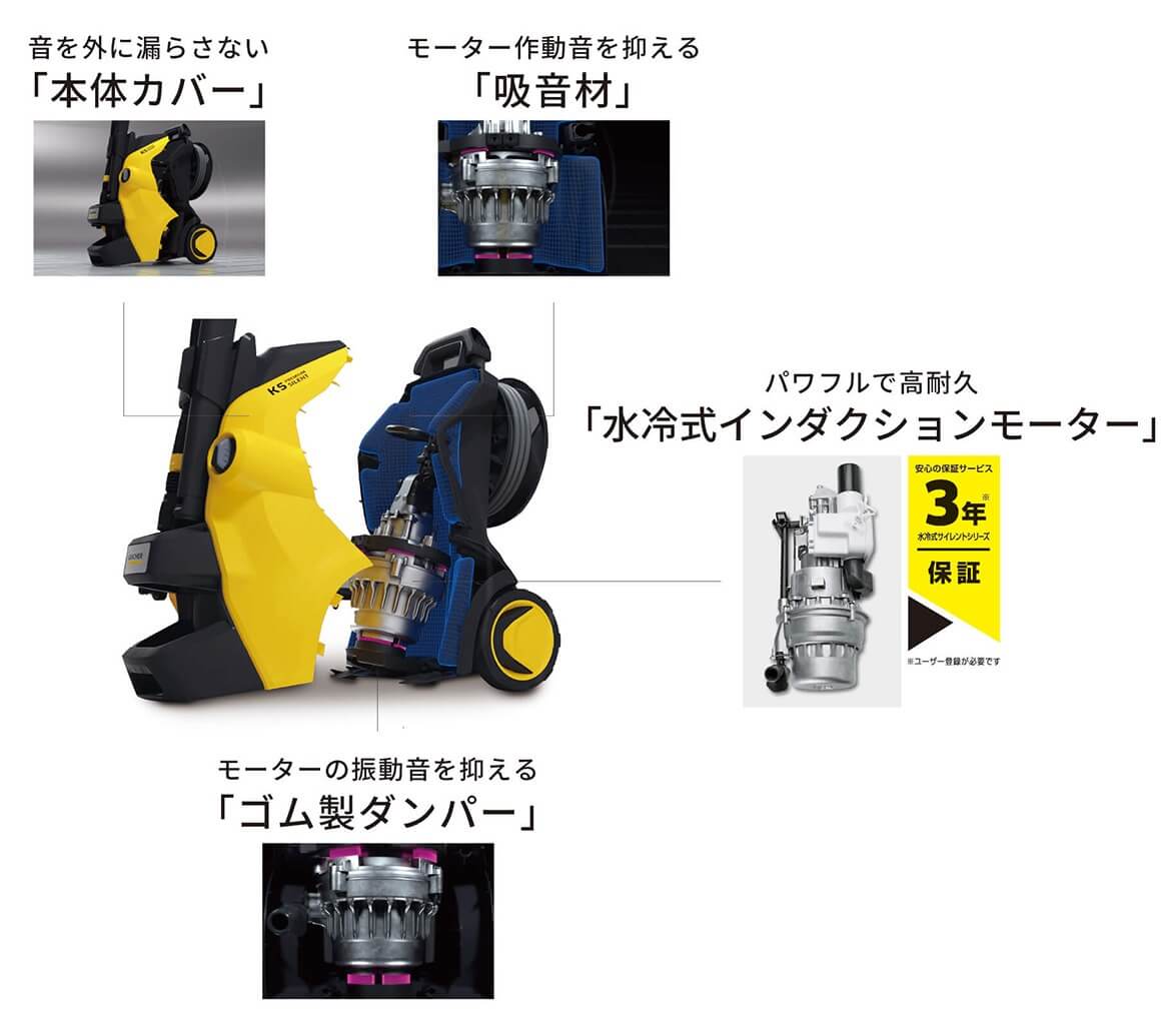 K 3以上は、家庭用製品で世界初の水冷式モーター搭載で、人が感じるノイズ音を50%削減。(弊社同クラス従来機比)