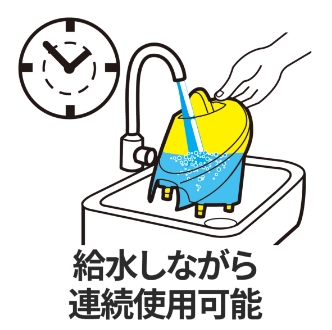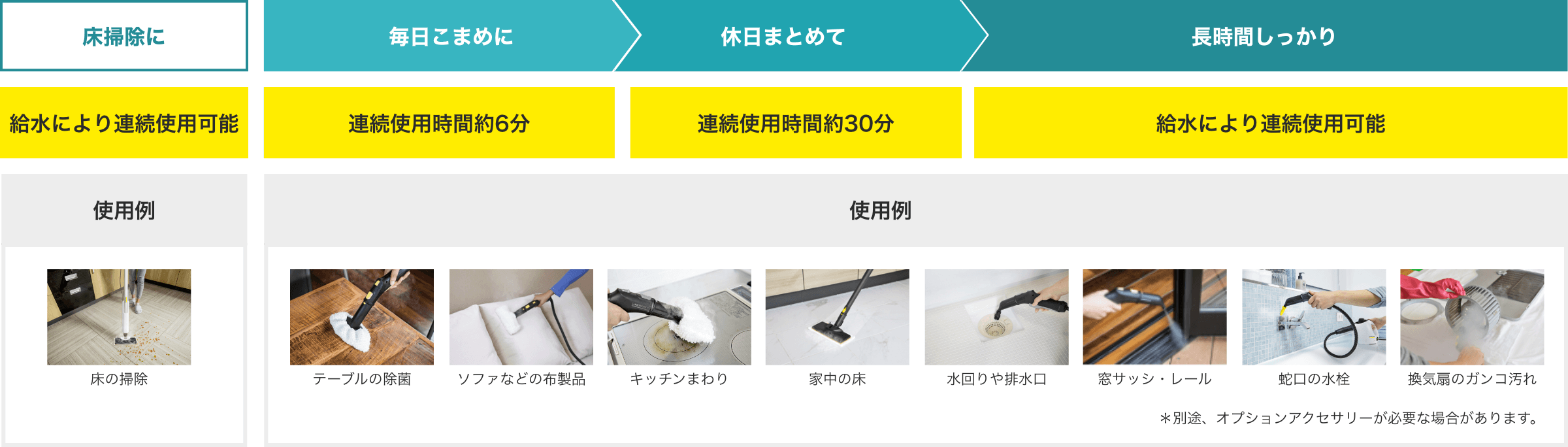 ヒートアップ(待ち時間)約35秒はケルヒャーのスチームクリーナーで最短、給水で連続使用が可能です。